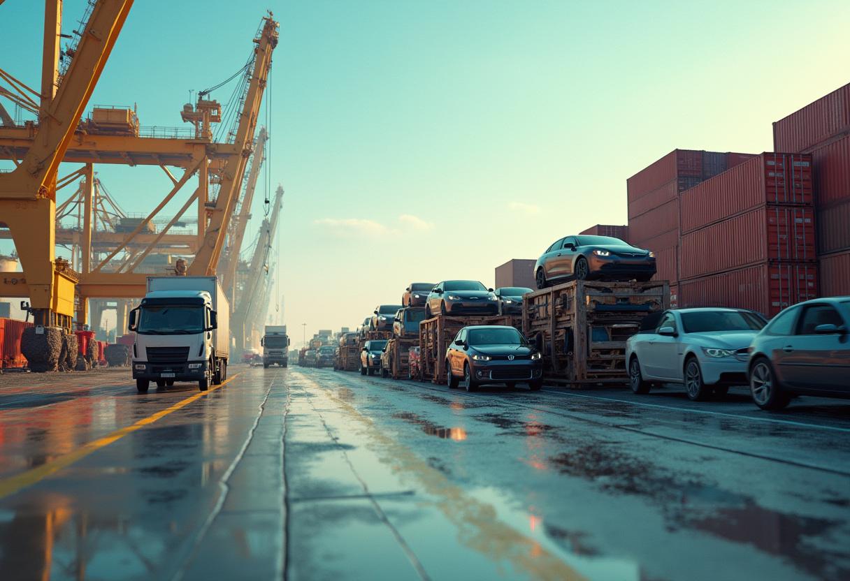 Autoexport 2025 – Deutsche Gebrauchtwagen für den Weltmarkt: Mehrere Gebrauchtwagen werden in einem Hafen für den Autoexport auf ein Schiff verladen: Ein realistisches Hafenszenario zeigt Fahrzeuge, die für den Export vorbereitet werden – ein typisches Bild der internationalen Nachfrage nach deutschen Gebrauchtwagen.