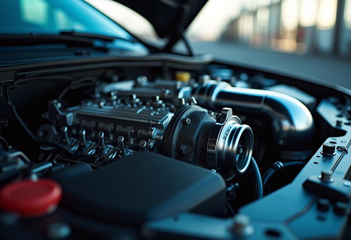 Motorschäden 2025 – Moderne Motorentechnik im Fokus. Nahaufnahme eines modernen Turbomotors mit komplexer Technik und empfindlichen Bauteilen. Ein detailliertes Motorfoto zeigt moderne Turbotechnik und Bauteile, die 2025 besonders anfällig für Schäden sind.